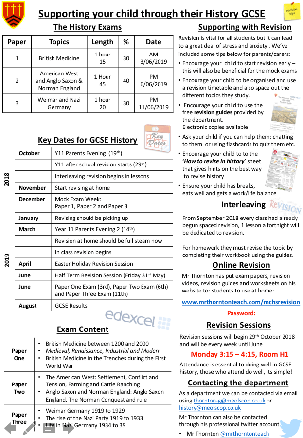 Therefore this sheet will be provided with our history bundle at Parents Evening, including our homemade revision guides, mock exam guidance and our ‘how to revise in history’ sheet (How do we revise for history?).
