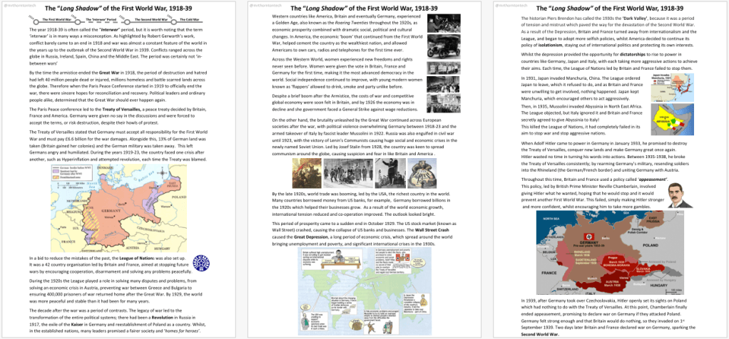 The plan with these overviews we use is that we sit them at the start of a time period to provide the big picture of where our subsequence enquiries are placed, allowing students to tether their new substantive knowledge from the EQs to the chronological framework. I remembered this blog post by Tom Sherrington, about ‘Big Picture, then Zoom in‘ and I think these do these well. I would liken these narrative, in part, to Mike Hills work on worldbuilding, as providing this overview allows students to get this sense of period and even place, and I plan to use images from the 1920-30s, on the board to supplement my reading.